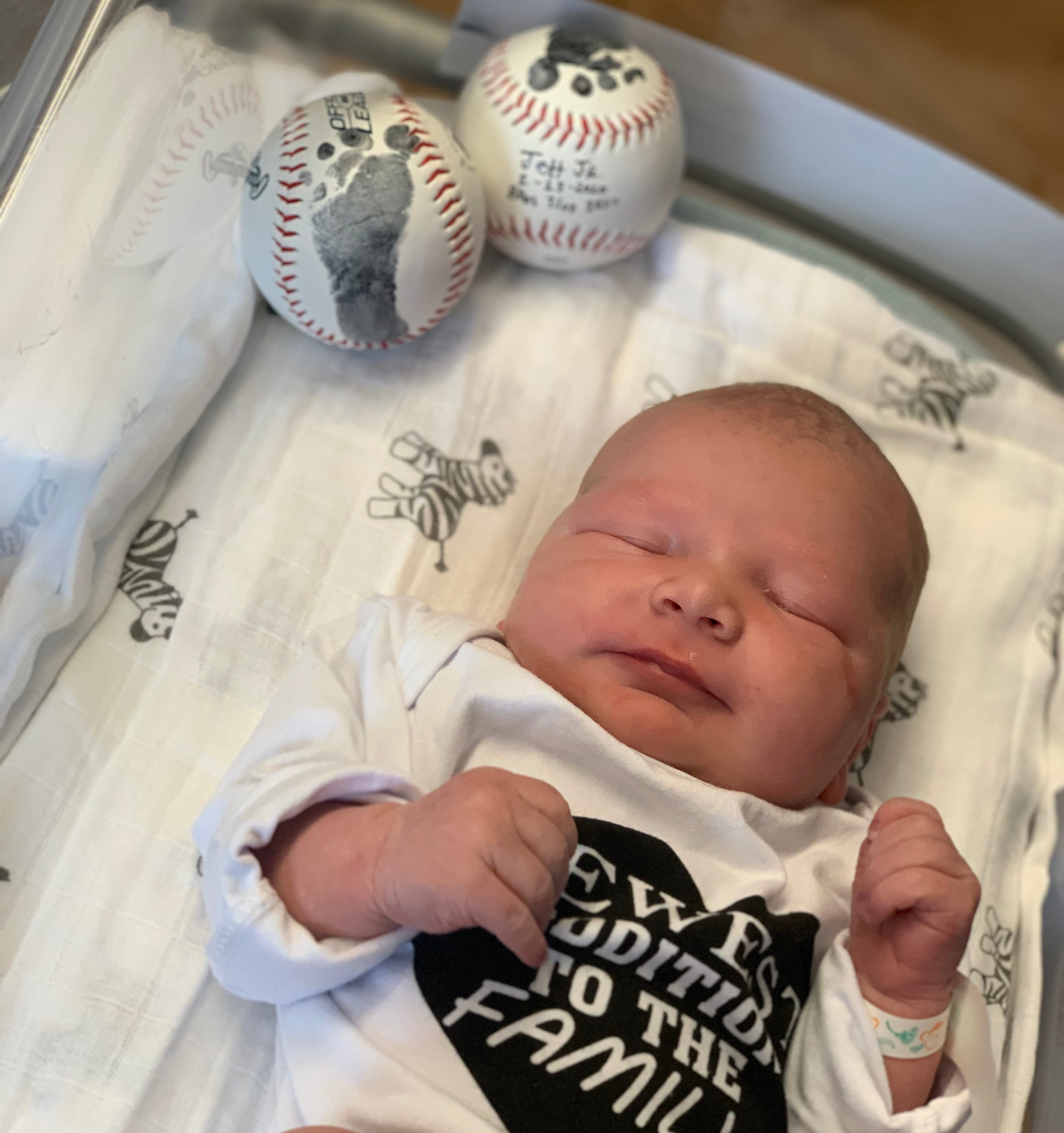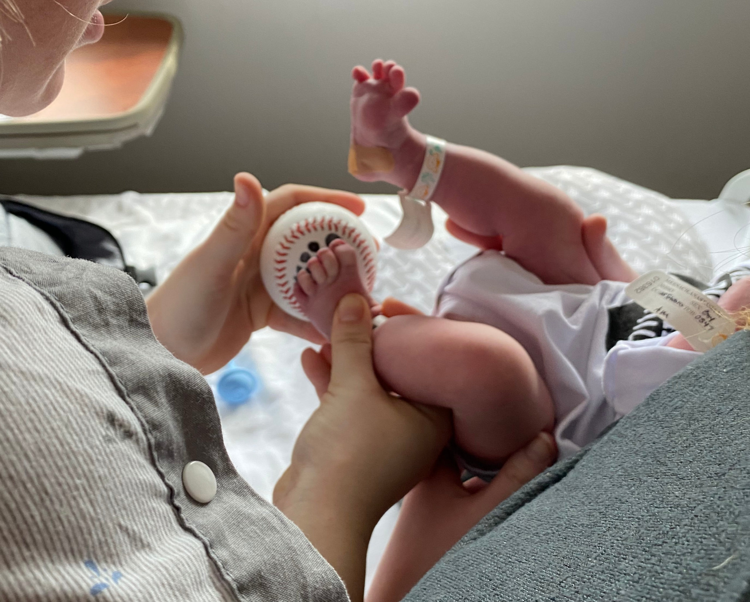 We did a few different versions of these prints. At the hospital, we stamped his foot on a baseball and used that in his newborn pictures with his measurements. The ink was very wet, make sure to dab a little off with a napkin before stamping the baseball or the ink will rub off. I also lightly wrapped the napkin over the print on the baseball to absorb some of the extra ink. Another little tip, stick pens like this work best to write on baseballs and make sure to write in the “sweet spot.”
